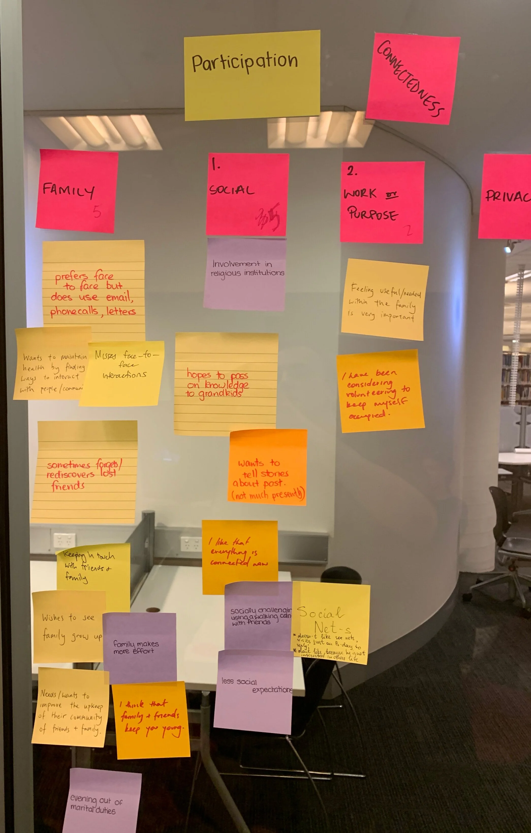 Affinity mapping to discover themes of “connectedness” in user interviews.